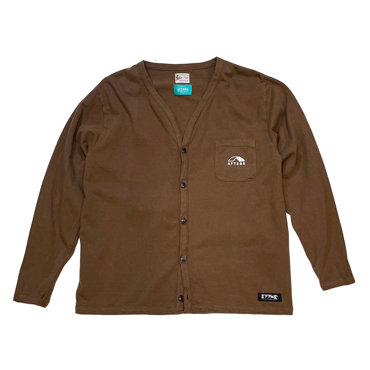 後染め加工を施したポケットカーディガン。左胸にシルクスクリーンプリント。AFTERSネーム。