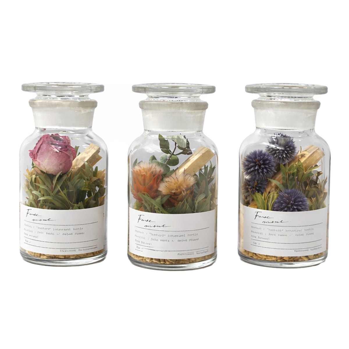 パロサントと色鮮やかなドライフラワーやプリザーブドフラワーをアレンジメントし、蓋を開けることで植物の香りも楽しめる観賞用商品です。