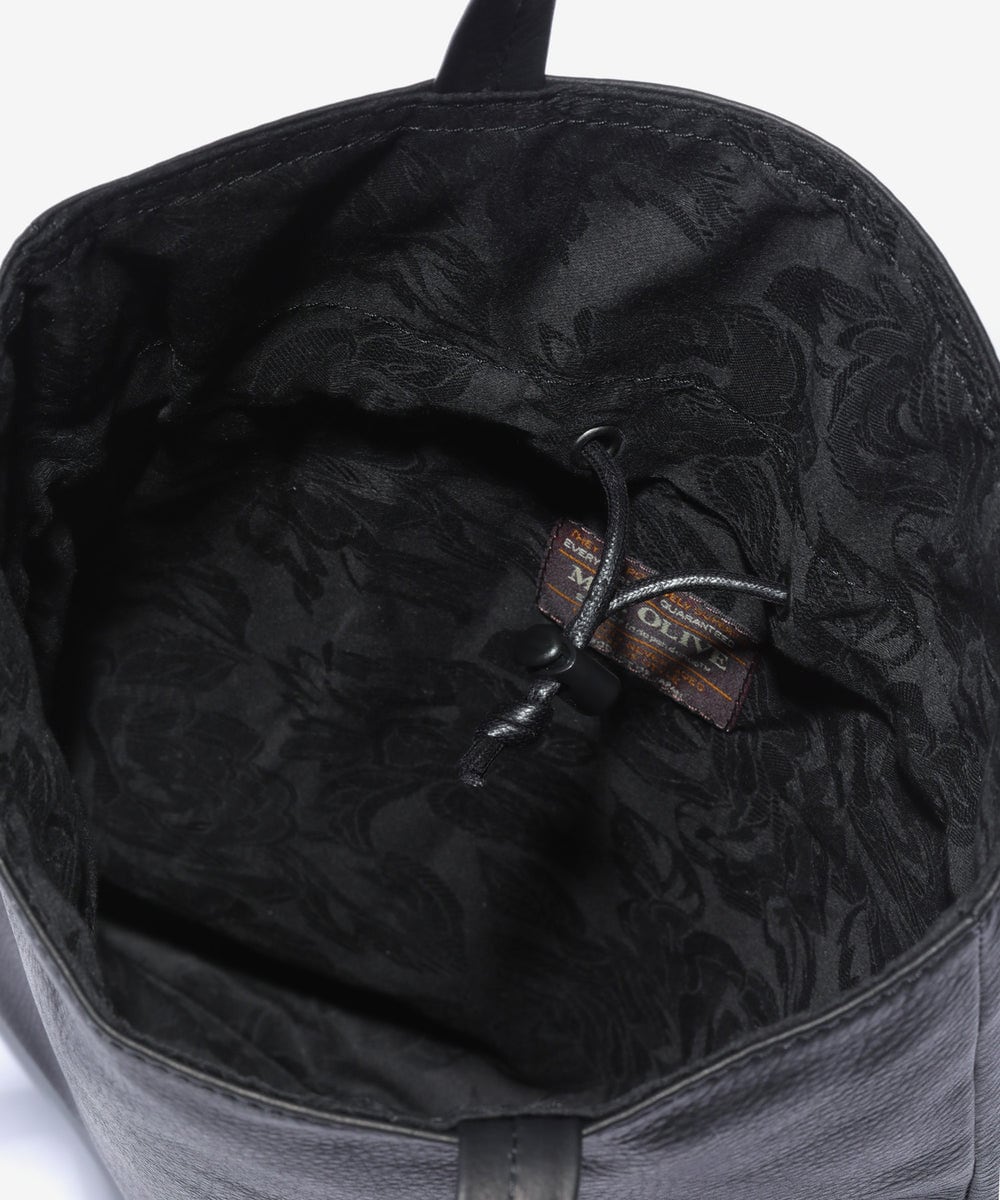 型にかけても手持ちしても様になるバランスでベルトの長さもコントロールしている。A4サイズが丁度良く収納できるサイズ。内側は巾着で開閉でき、防犯性もある仕様。裏地はオリジナルフラワー柄ジャガード。 男女兼用できるユニセックスモデル。