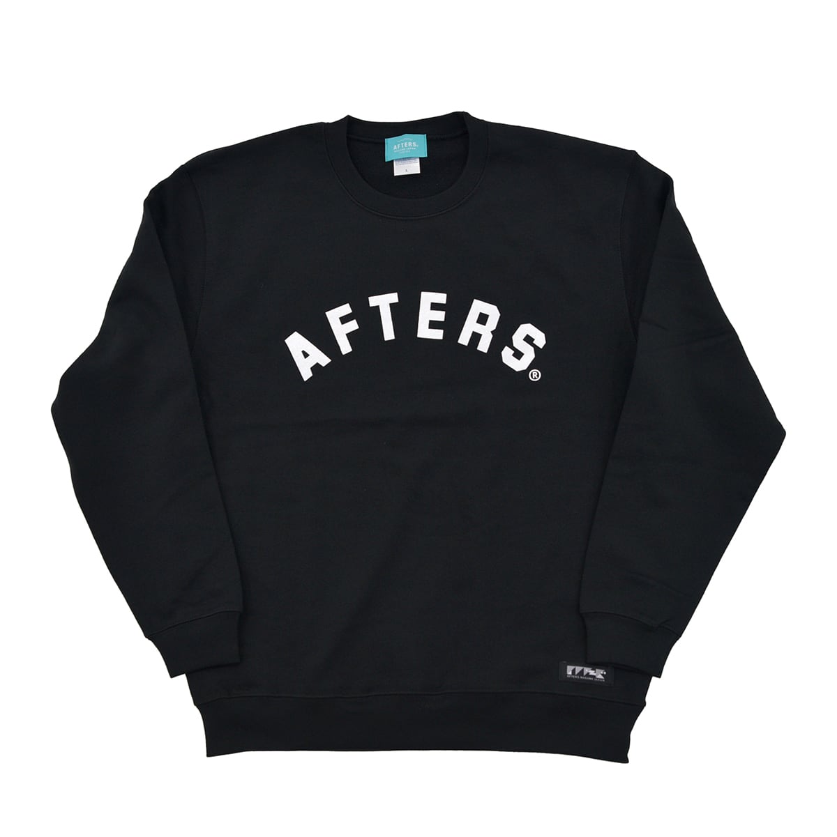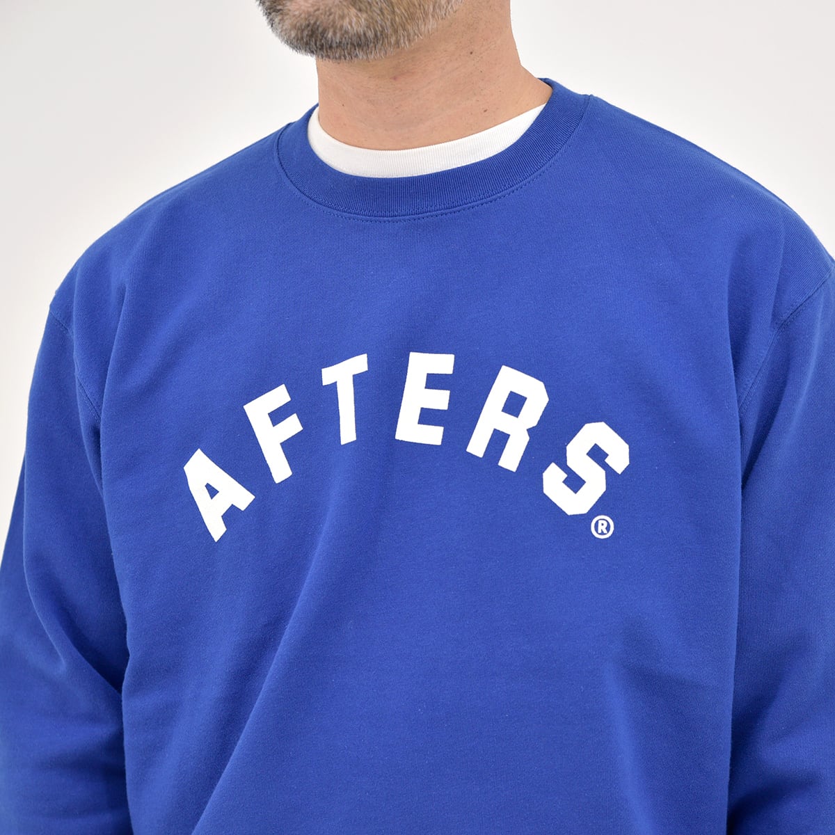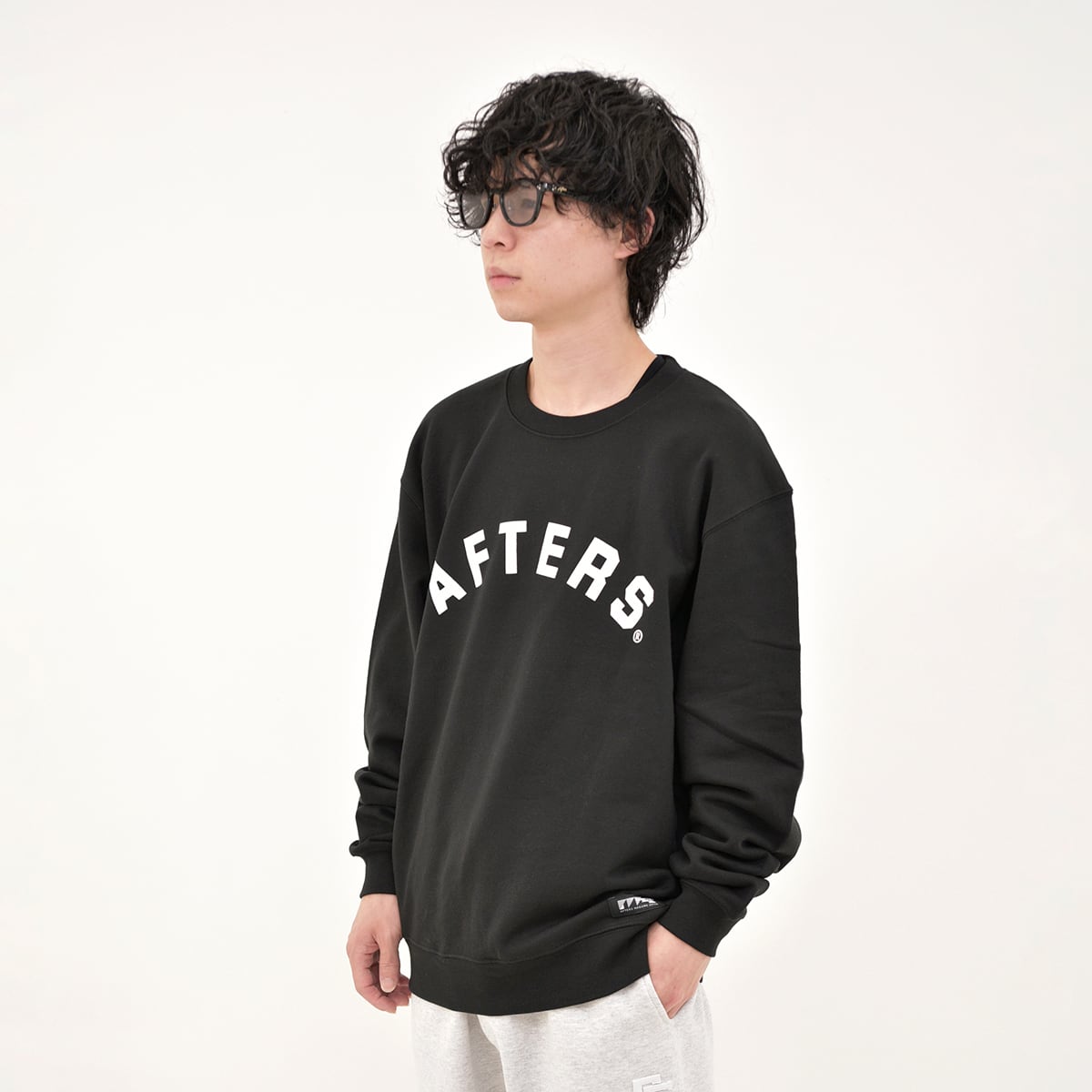 吸水性・伸縮性の優れた裏パイル地に、襟リブ・袖口・裾口にダブルステッチを施した、丈夫さとリラックス感を兼ね備えた10オンスのスウェット。フロントにシルクスクリーンプリント。AFTERSネーム。